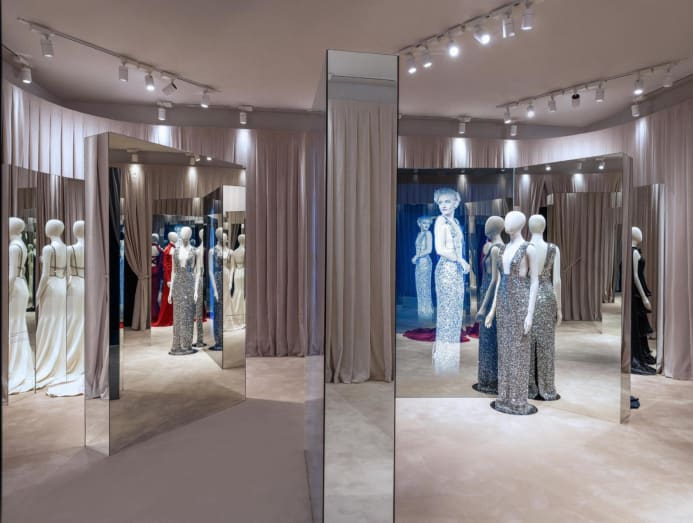 Digital screens and mirrors create yet another immersive experience here, and also add another dimension to the curated bespoke gowns on display.
