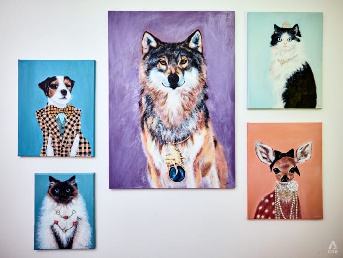 Lim’s education background and time spent at photoshoots for work also served as inspirations. “I used to do illustrations of models wearing designer outfits so I thought ‘Why not put them on the animals too?’. It’s like how a fashion stylist fits a model during a photoshoot. I like to look at what’s on the canvas and see what could match with it.”