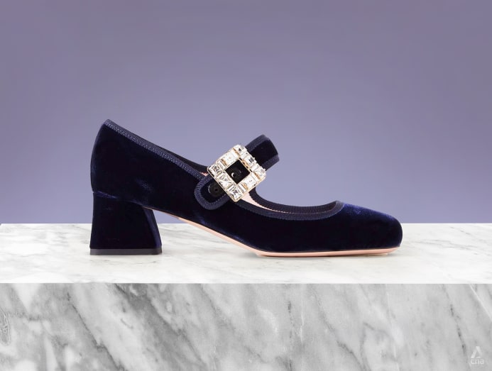 Clearly a luxe version of the iconic shoe style, in plush navy velvet and with a crystal-embellished buckle, which is a sparkling signature feature of the French shoe designer.