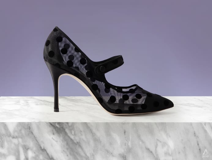 Manolo Blahnik Campari 90 polka-dot mesh Mary Jane pumps, S$1,446, from Net-a-porter.com
