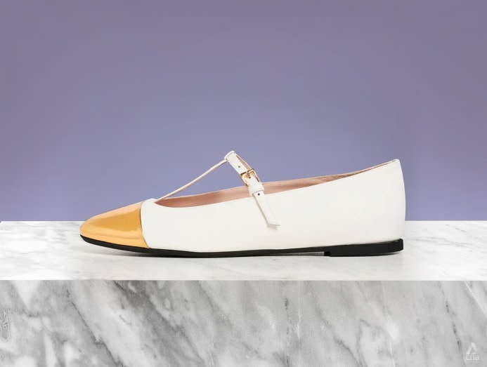 A T-bar design with gilded toe caps for a gleaming accent that looks chic paired with pure white.