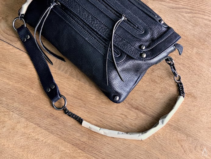 Exposed hardware can leave marks on your bag. Chains, zippers, rivets and buckles that are left to sit against the bag can leave indentation marks. Wrap chain link straps in soft tissue or cloth and place them inside the bag so they never get a chance to leave marks on the leather. Also avoid placing your purses too closely together as exposed hardware can scratch or leave marks on the other bag that is pressed up against it.