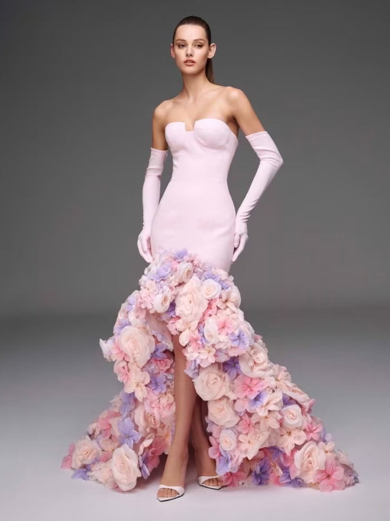 Liu’s floral ensemble was reminiscent of the resplendent Nicole + Felicia pink gown that Jennifer Lopez wore to the Golden Globes Awards this January – except that JLo had a long train and larger florals to match the grandeur of the occasion. So impactful was the look that Lopez flaunted yet another similar creation by the brand for her performance on Saturday Night Live just a month later, this time, a cape-styled gown fully cloaked in huge pink roses.