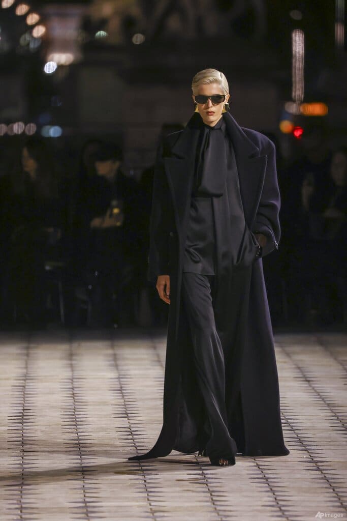 Dramatic 80s shoulders, column silhouettes – and hoods – harked from the heyday of the late Yves Saint Laurent at the Parisian stalwart's Tuesday evening show (Sep 27), all set to the twinkle of the Eiffel Tower.