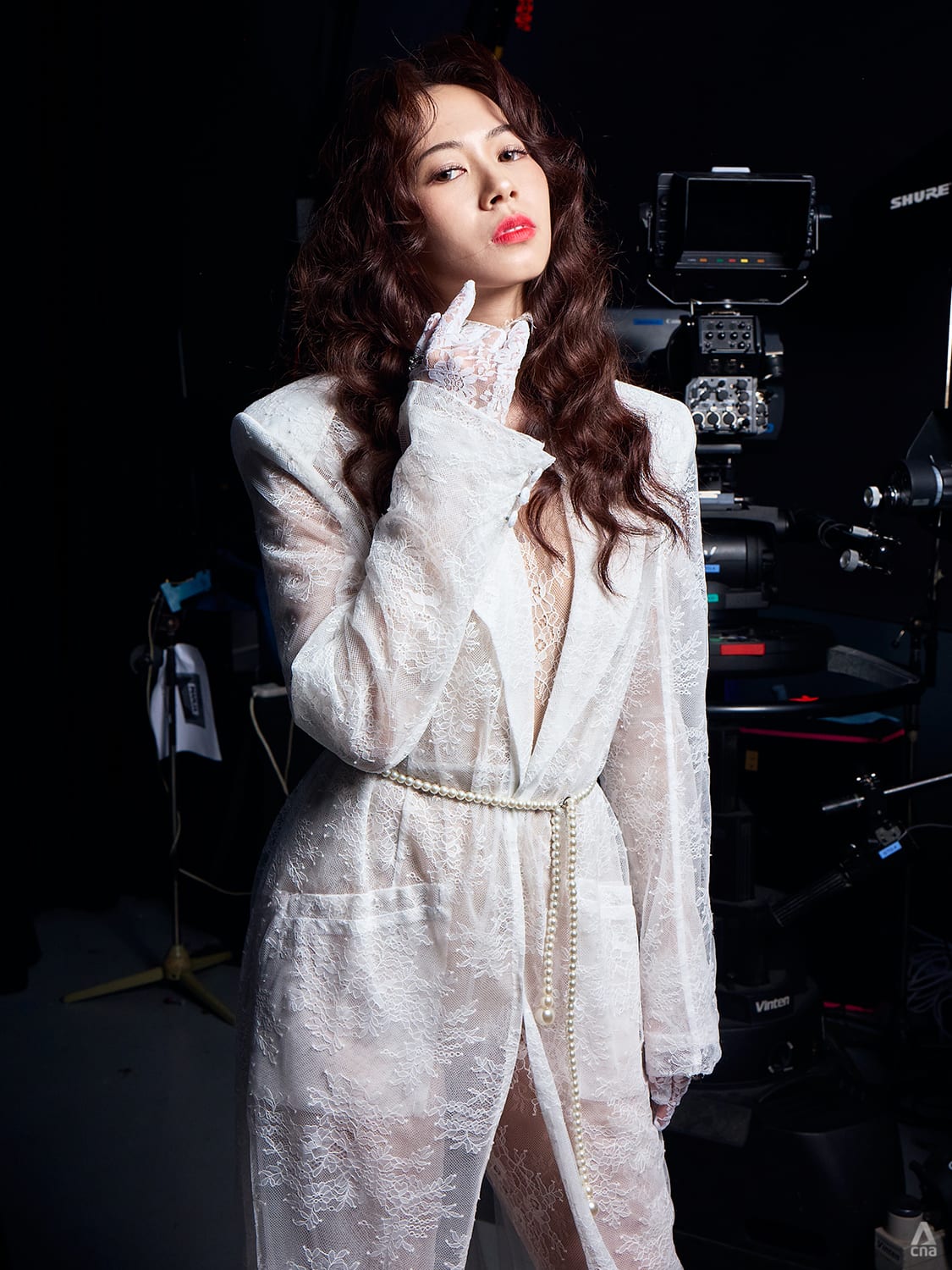 Bonnie Loo’s white lace look by designer Brian Khoo teases the imagination.