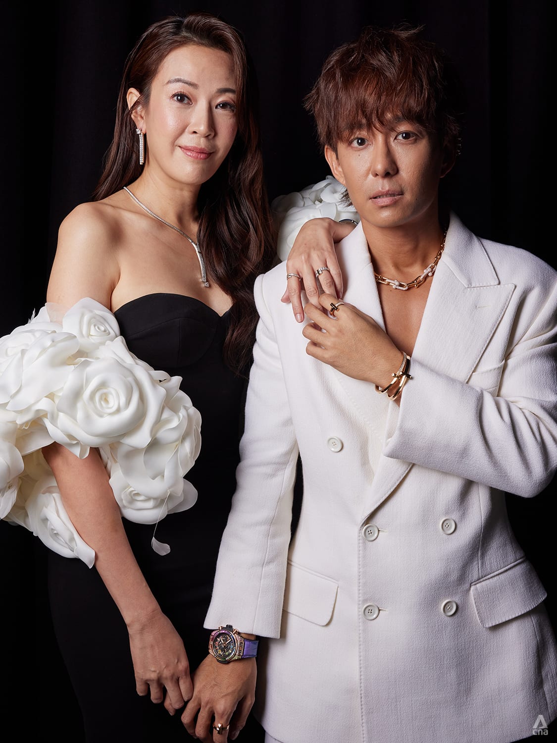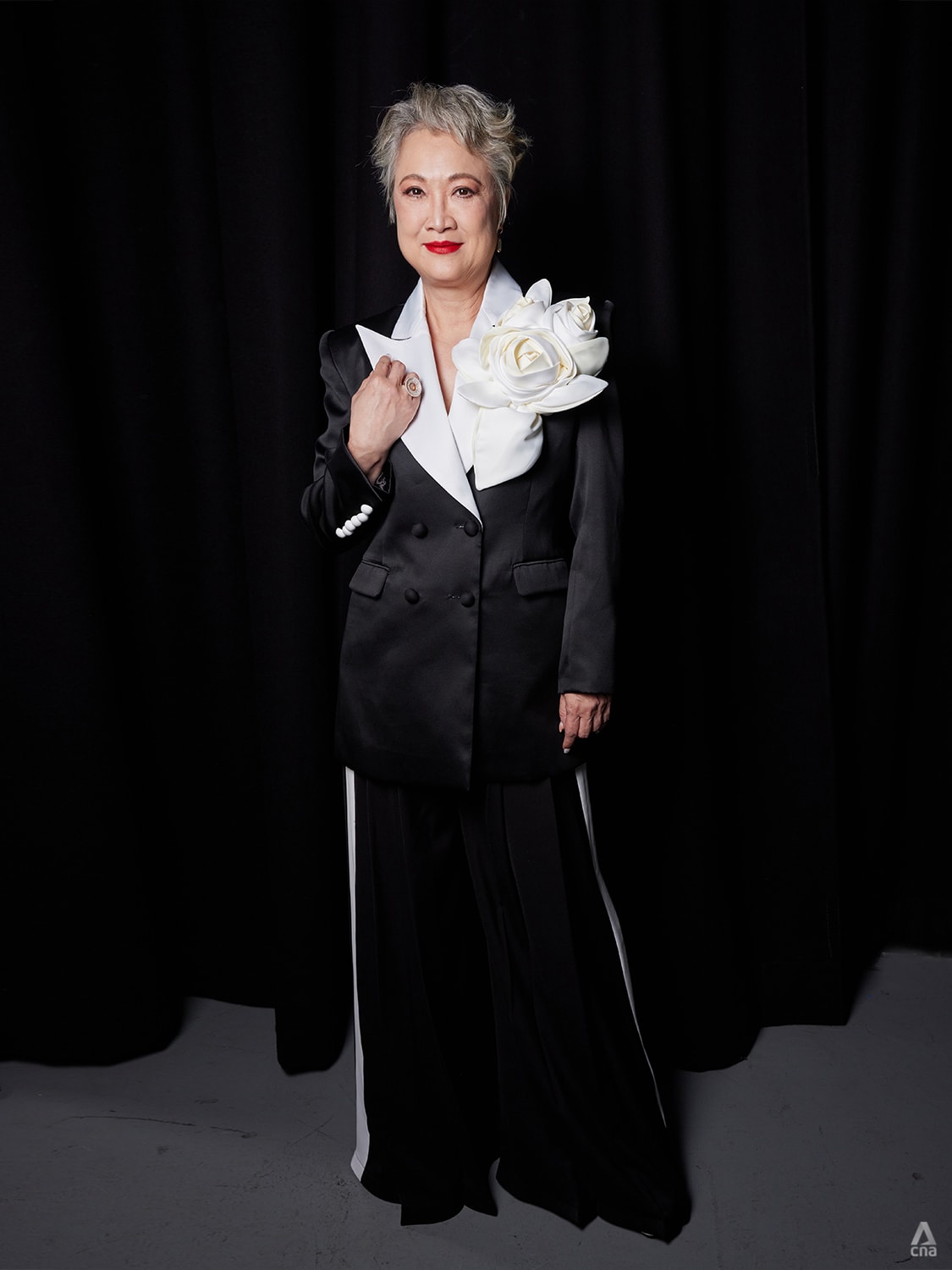 Hong Huifang’s black and white satin suit flanked by oversized rosettes is made even more powerful with that statement ring by Singaporean jeweller State Property Fine Jewellery.