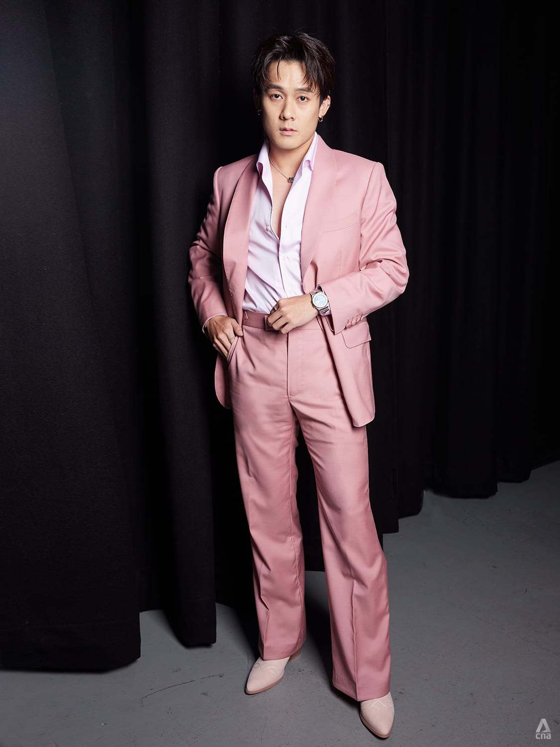 For an unexpected twist, singer Nathan Hartono skipped the crisp shirt for a floaty tunic.