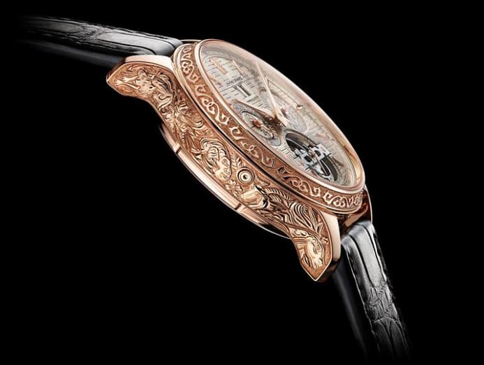 This one-of-a-kind Chopard number is aimed squarely at the Chinese tycoon who wears his heritage proudly. The patterned dial, reminiscent of Chinese fretwork, gives way to an elaborate 18K rose-gold case that’s painstakingly etched with all 12 animals of the Chinese zodiac.