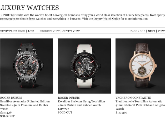 Sincere Fine Watches’ e-commerce platform has a Laurent Ferrier dual timezone watch for S$136,000. And on Net-a-Porter’s sister (or should it be brother?) site Mr Porter, you can have a one-of-a-kind Roger Dubuis watch with a skeletonised dial for £213,516 (S$371,856).