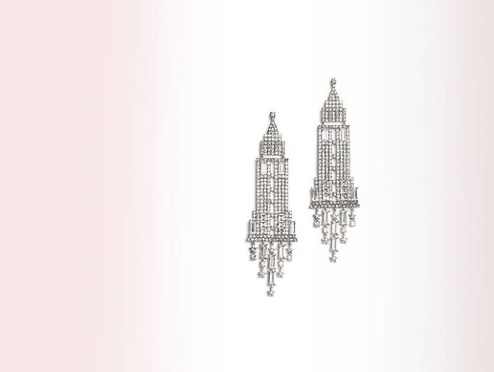 These sparklers are designed for those with New York on their minds. Equal parts Art Deco and contemporary, these shoulder dusters work like a charm, whether dressed up with a darkly sexy gown or dressed down with a simple tee.