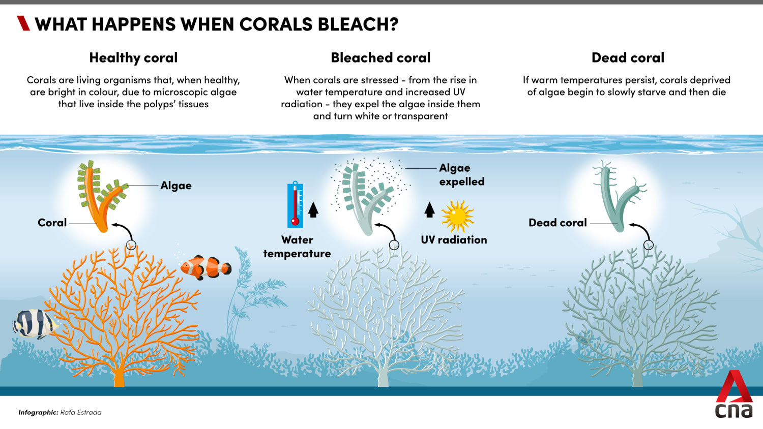 Bleaching happens when corals start to expel the photosynthetic algae that live inside them. The algae normally gives them their bright colours and food supply. Once the distressed corals have turned white, if warm temperatures persist, they can then die.