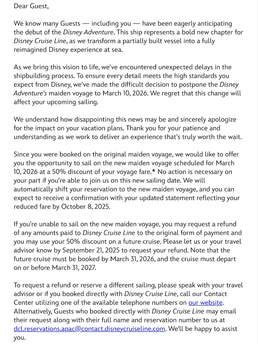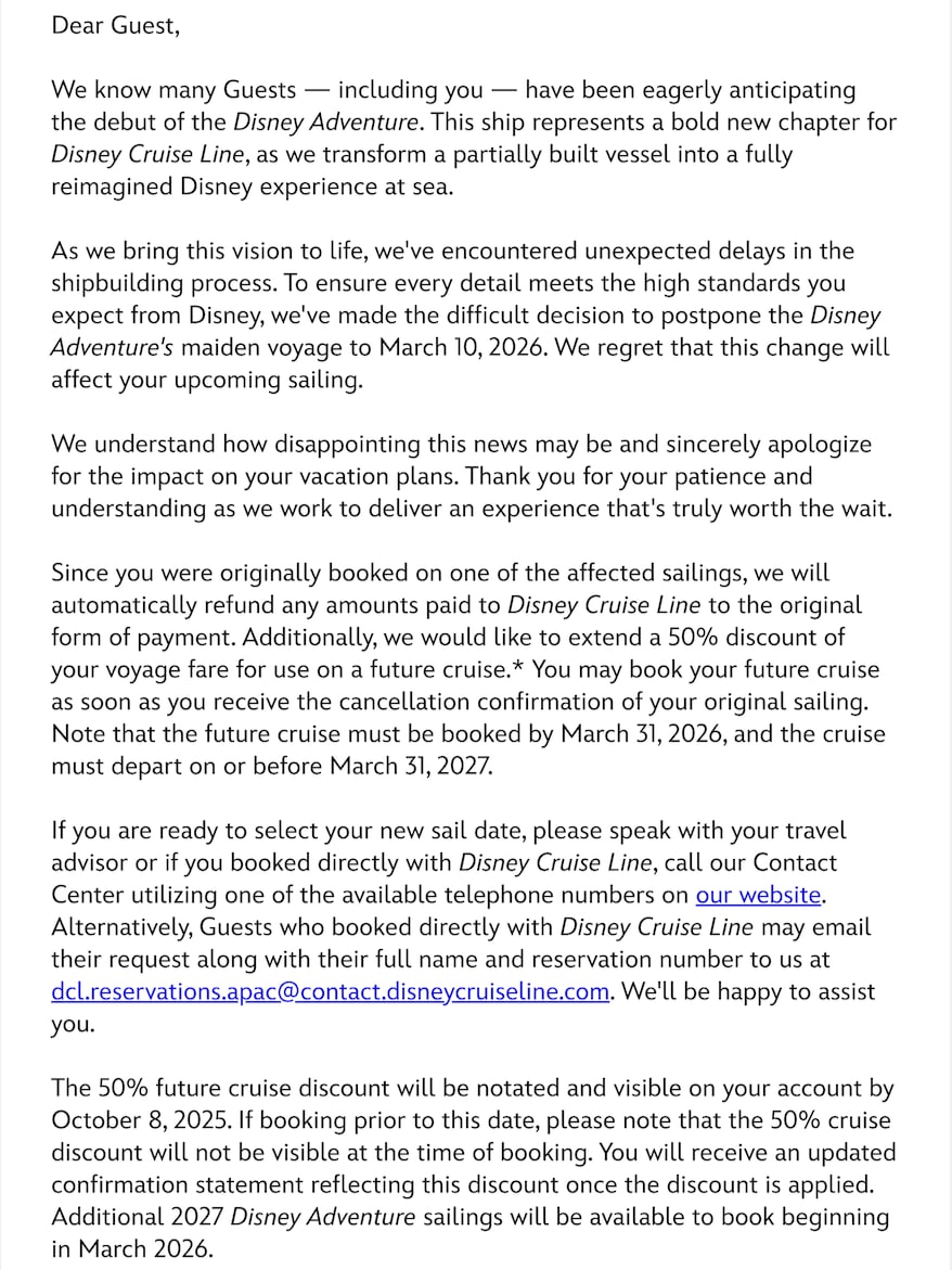 If they cannot make it for the new date, they may request a full refund and still use the 50 per cent discount towards any future Disney Cruise Line voyage booked by Mar 31, 2026, for sailings departing by Mar 31, 2027.