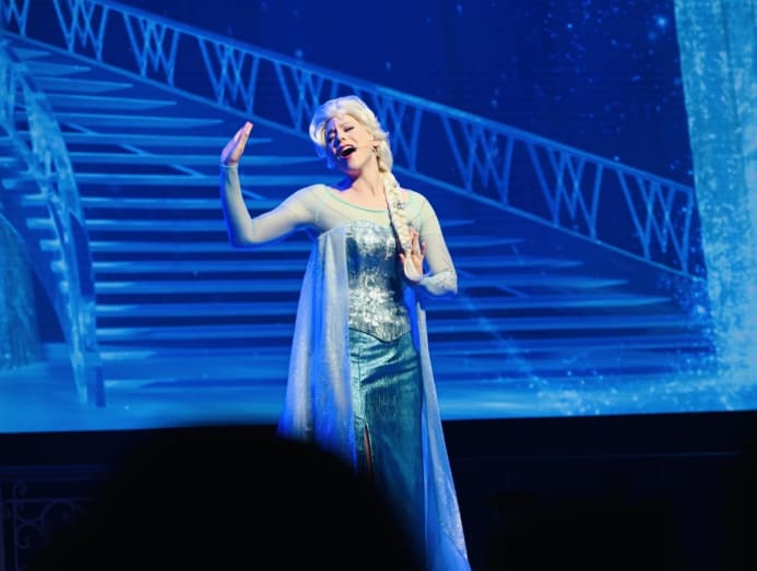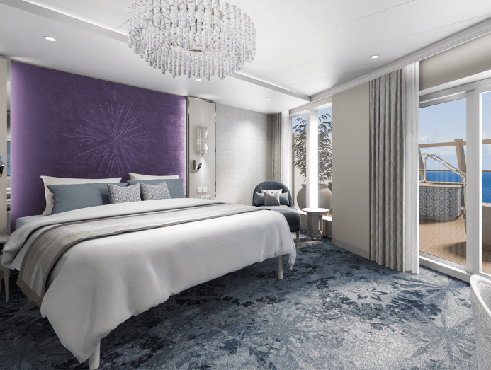 The ship will also have two royal suites themed after Frozen characters Anna and Elsa. The former evokes summertime with rich wood tones and purple accents. The latter has icy light fixtures and snowflake patterns.