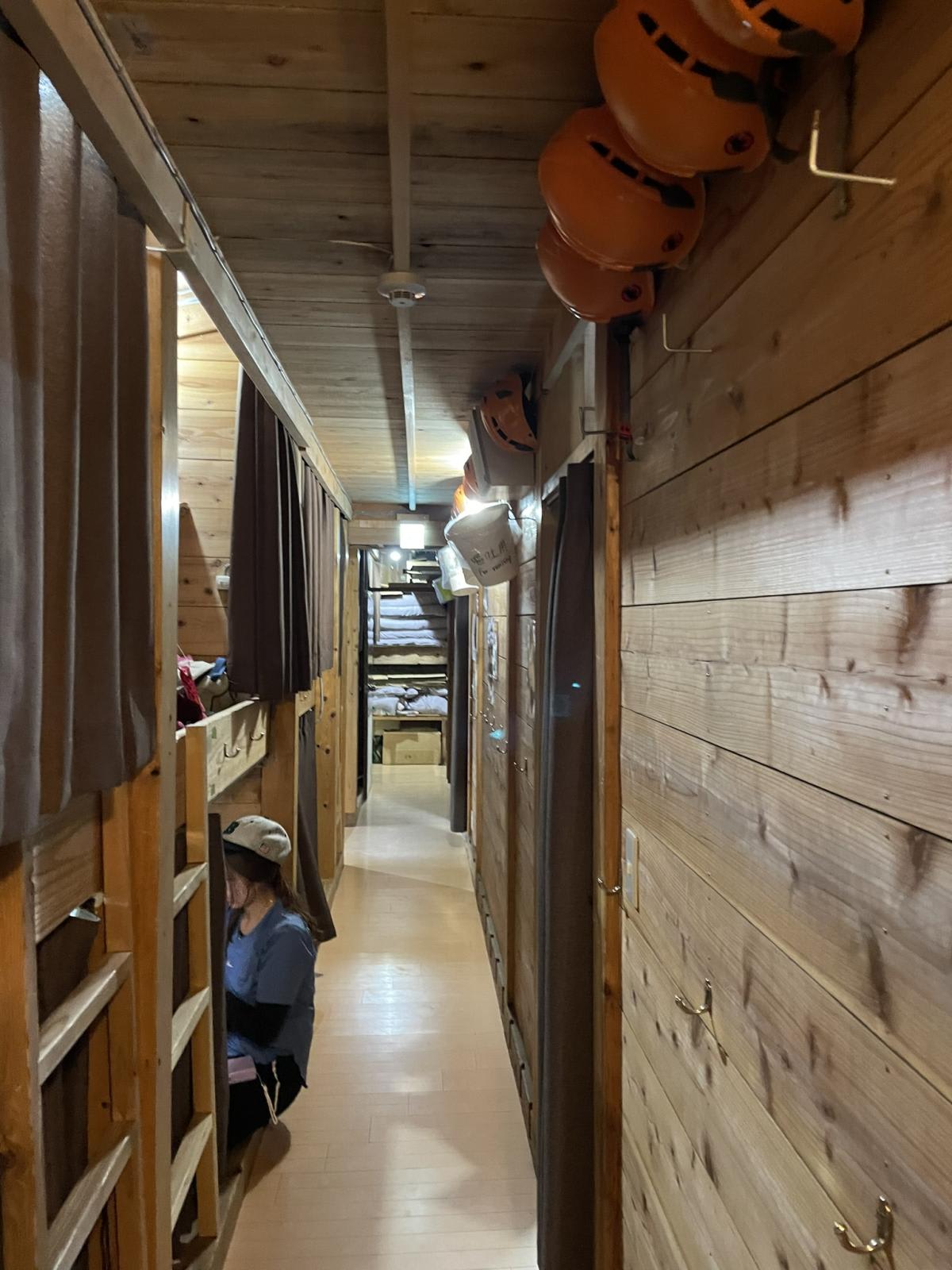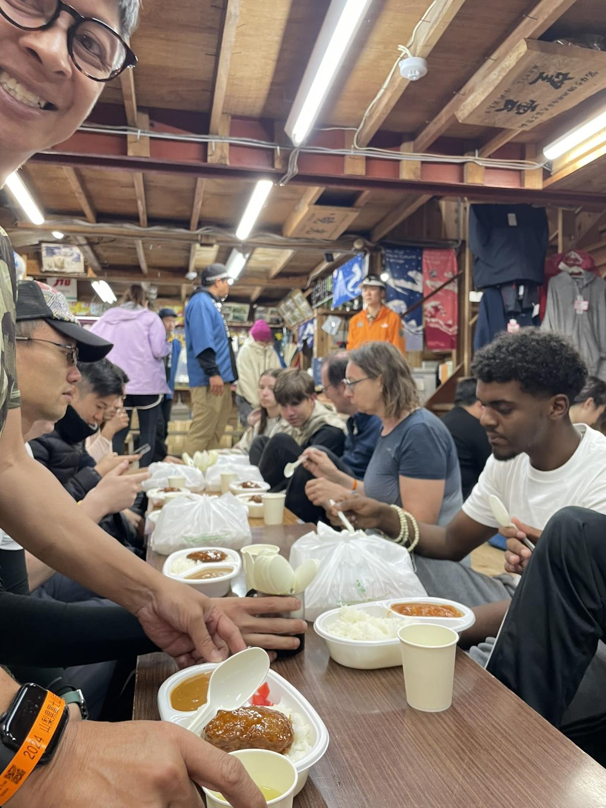 We were assigned our beds for the night. You sleep in a row with other climbers, but you get a comfortable mattress, a pillow and a blanket. There are no shower facilities, so after a wipe down, we headed to the dining area for dinner – rice with curry, a hamburger patty, some pickles and a cup of tea. Of course, you can order more items, such as miso soup or cup noodles.
