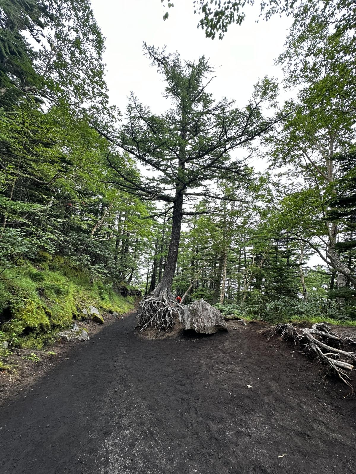 The Yoshida Trail begins through a forested area. The terrain from the 5th to 6th Stations is mostly flat, and it is easy to walk on the volcanic ash and soil.