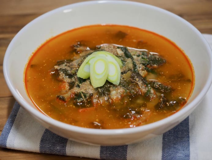 The nourishing soup, generously garnished with chives and served hot in a ttukbaegi (earthenware pot) makes a good break from all the sweet-spicy Korean dishes. Mix in the rice and season it as you like with saeujeot (salted fermented shrimp), kimchi, and gochujang (red chilli paste).