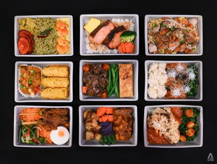 A display of nine new dishes from the Book The Cook menu that Premium Economy class passengers may pre-order for SIA’s flights at the unveiling of the airline’s revamped Premium Economy in-flight experience on Mar 14, 2024. (Photo: CNA/Eugene Goh)