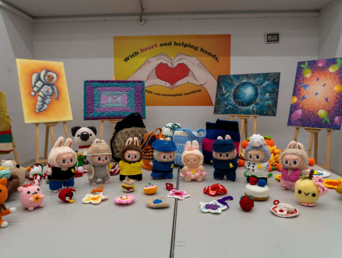 Inmates participating in the Art Behind Bars (ABB) programme at Changi Prison Complex’s Institution A4 have been crocheting outfits for Labubu dolls. Some of these adorable outfits include crochet sweaters, cardigans and hats.