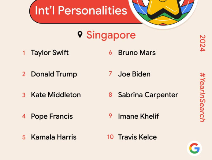 Taylor Swift also topped the list of international personalities searched by those in Singapore, with her beau Travis Kelce joining at 10th. Other famous names include Donald Trump at second place and Bruno Mars at sixth.