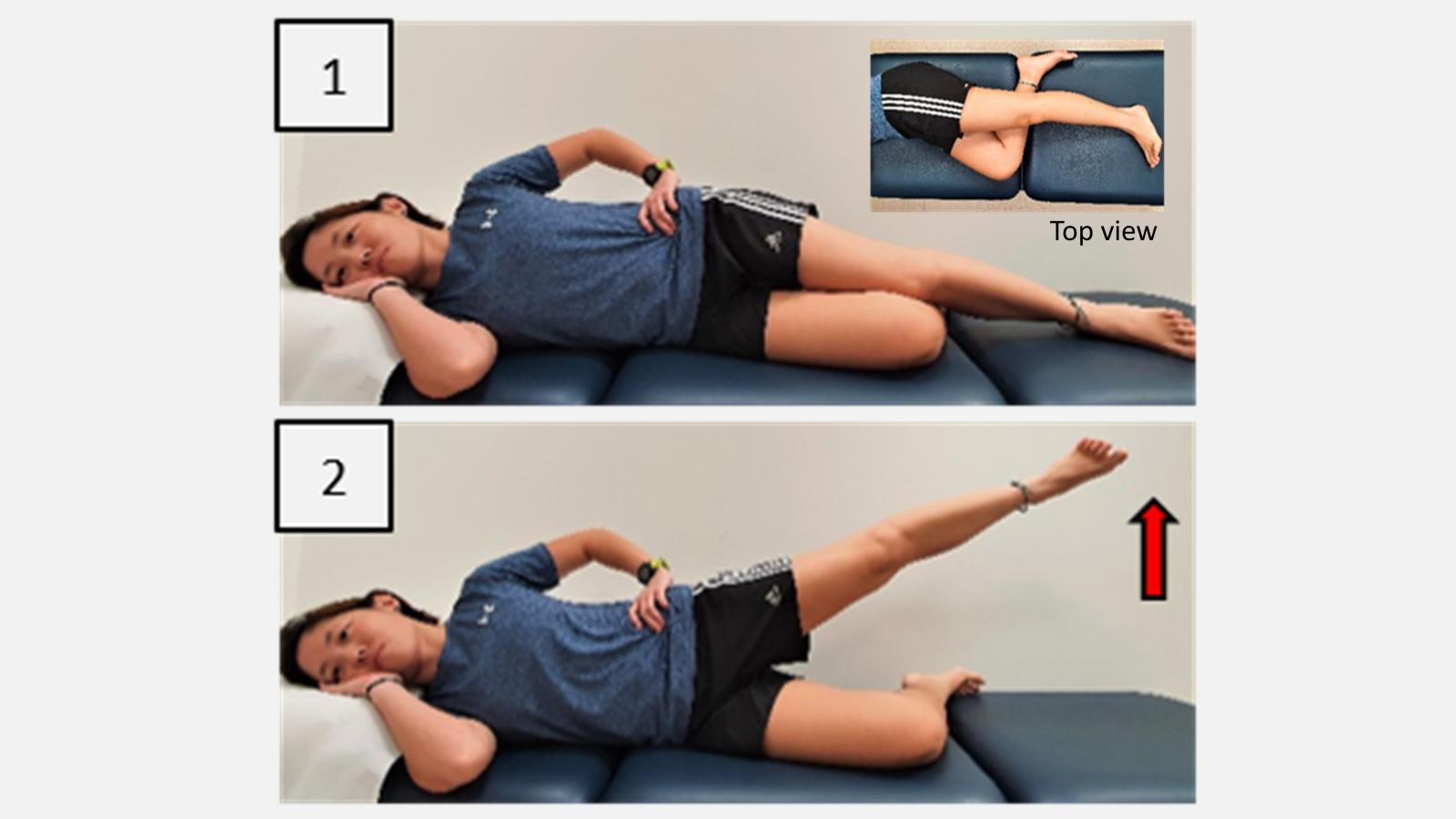- Lie on the side of unaffected leg, keeping hip and knee bent. See top view.