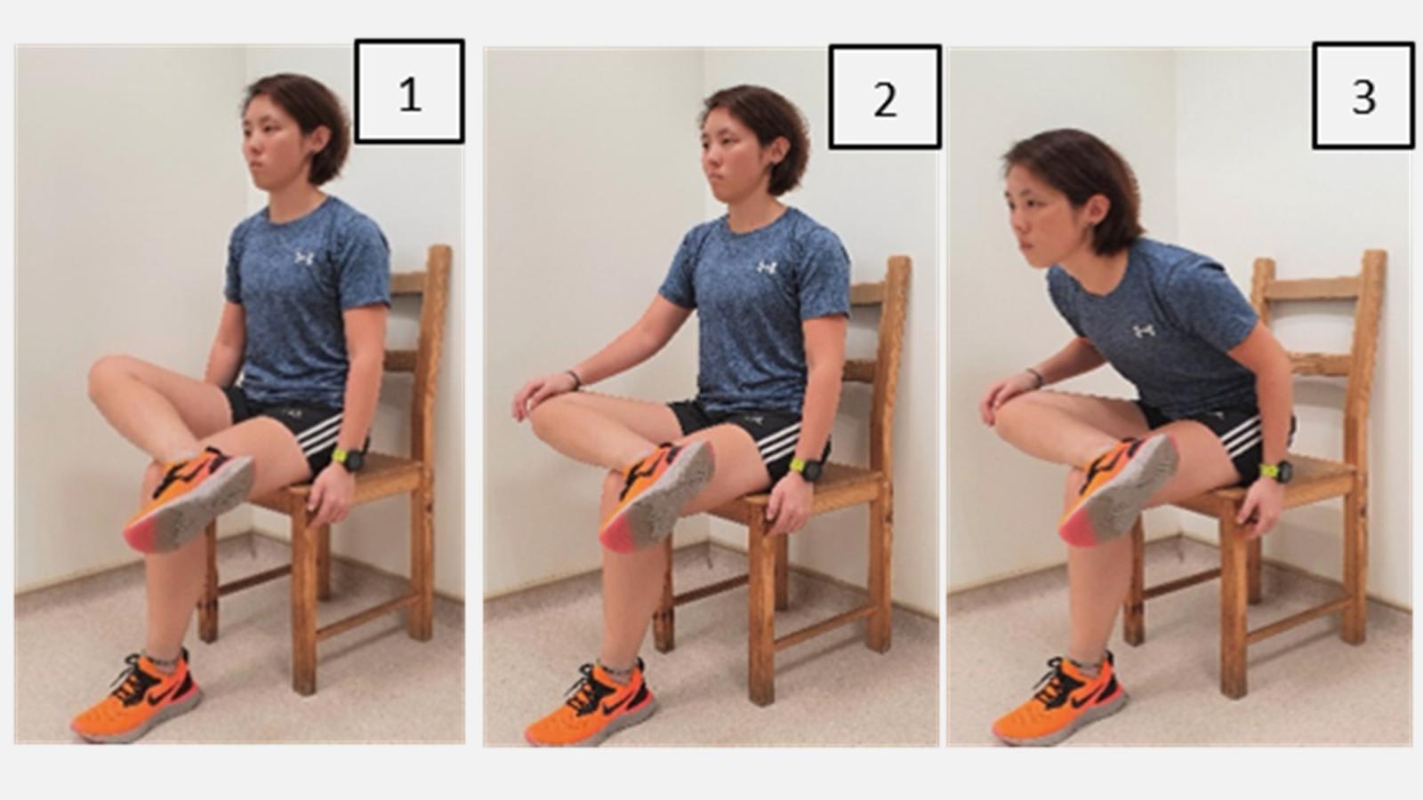 - Sit close to edge of chair. Cross affected leg over unaffected knee.