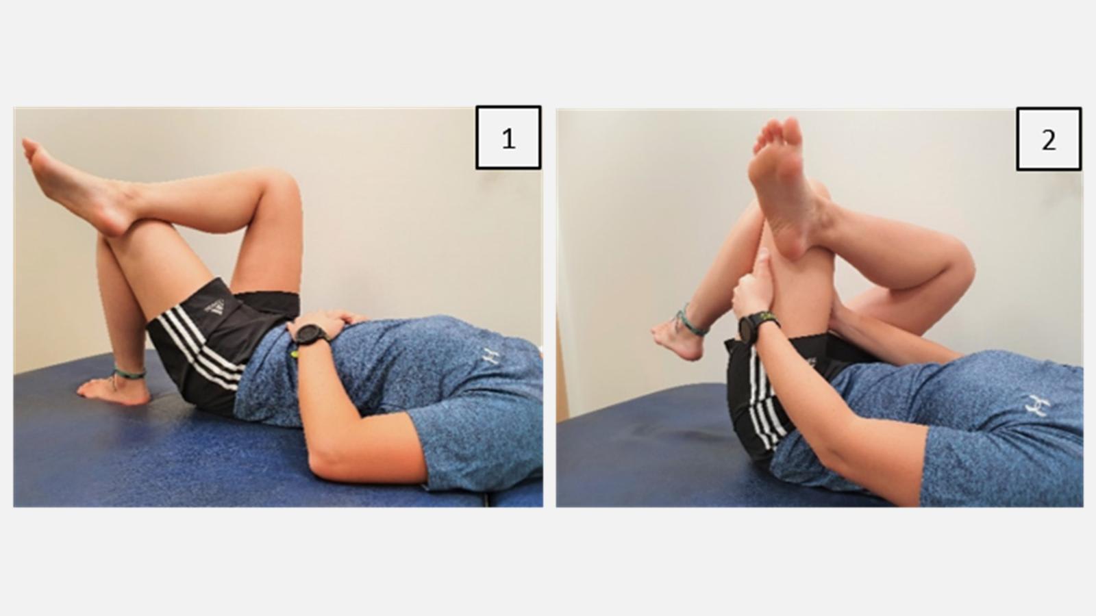 - Lie on your back. Cross affected leg over unaffected knee.