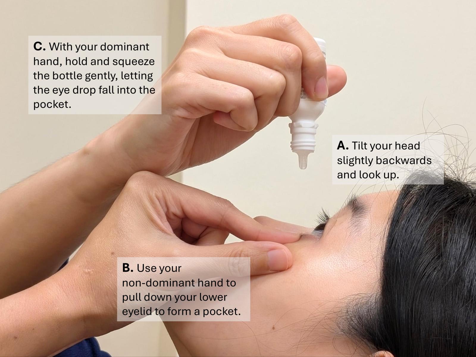To improve your aim, “rest the hand holding the bottle on the back of the hand pulling the eyelid”, said Tan. “This way, you can be more certain of the distance between the bottle and your eye. Then, with the tip of the bottle positioned steadily within your sight, the droplets are more likely to get into your eye.”