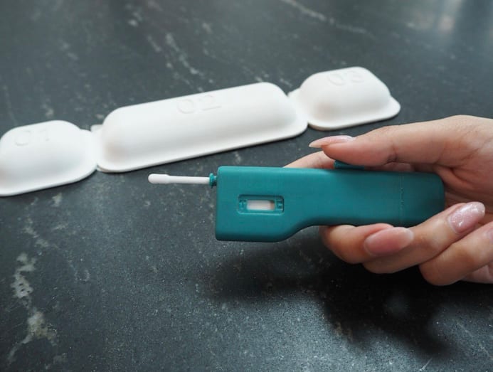 The swab is placed in a diagnostic solution, and within minutes, results appear on a strip similar to COVID-19 or pregnancy test kits.