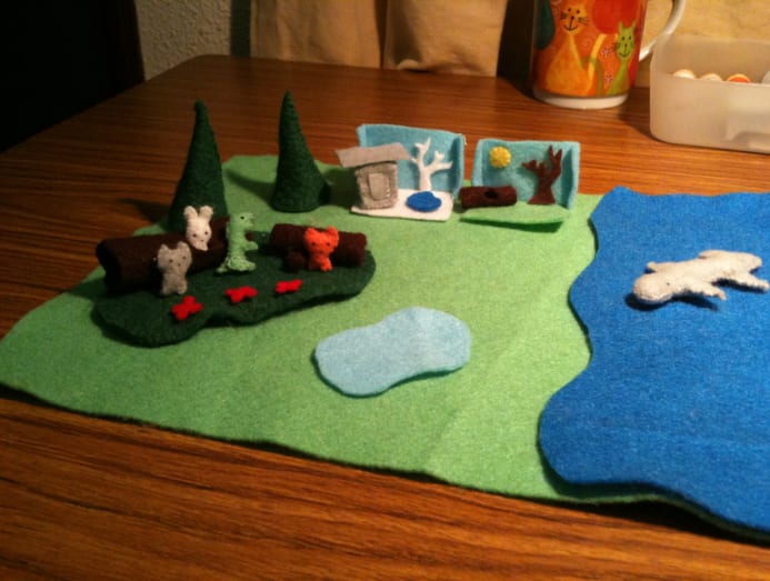 During those quiet moments, I made tiny wool toys and wool-felted dioramas to surprise my children in the morning. They were always delighted. These toys now have a permanent home in their treasure boxes.