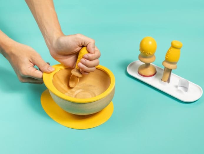 Some might call these baby utensils. Lim, however, prefers to call them toys because they were designed to encourage visually impaired babies to play with their food.