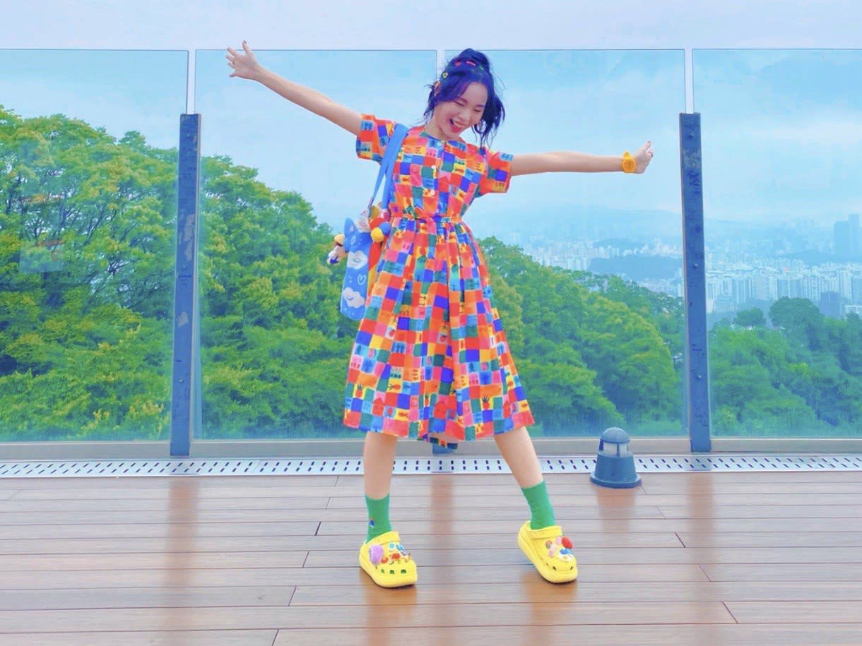Kuah is decked out in brights from head to toe, down to her nail art and shoes. Her outfit is a riot of yellow, green, blue, orange, and everything in between. “They say colours bring happiness, and I totally agree,” said Kuah, who told CNA Women that she is unable to pick just one favourite colour.