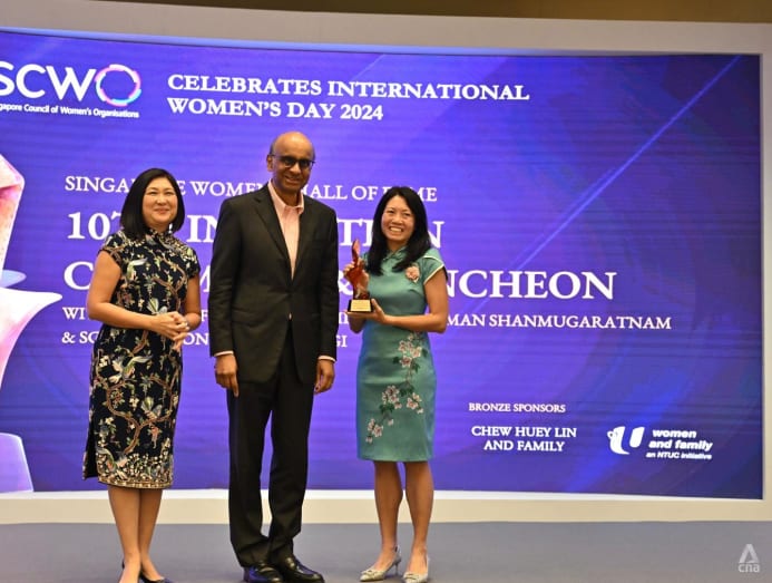 The 10 inductees of the 2024 Singapore Women’s Hall of Fame with President Tharman Shanmugaratnam, Jane Ittogi Shanmugaratnam and Junie Foo, President of Singapore Council of Women’s Organisations. (Photo: CNA/Jeremy Long)