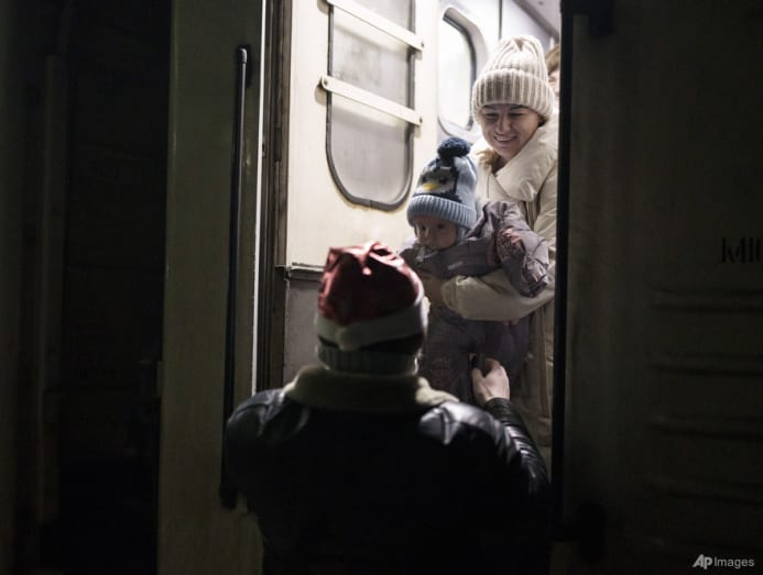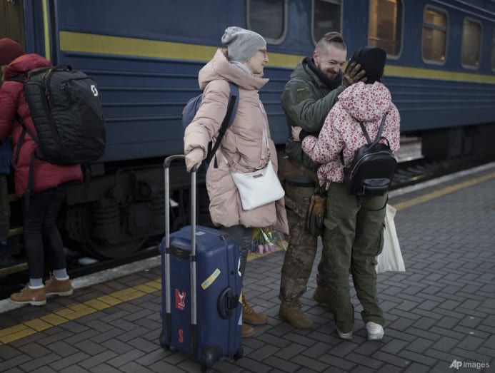 At Kyiv’s central railway station on Saturday (Dec 31) morning, Mykyta, still in his uniform, gripped a bouquet of pink roses tightly as he waited on platform 9 for his wife Valeriia to arrive from Poland. He hadn’t seen her in six months.