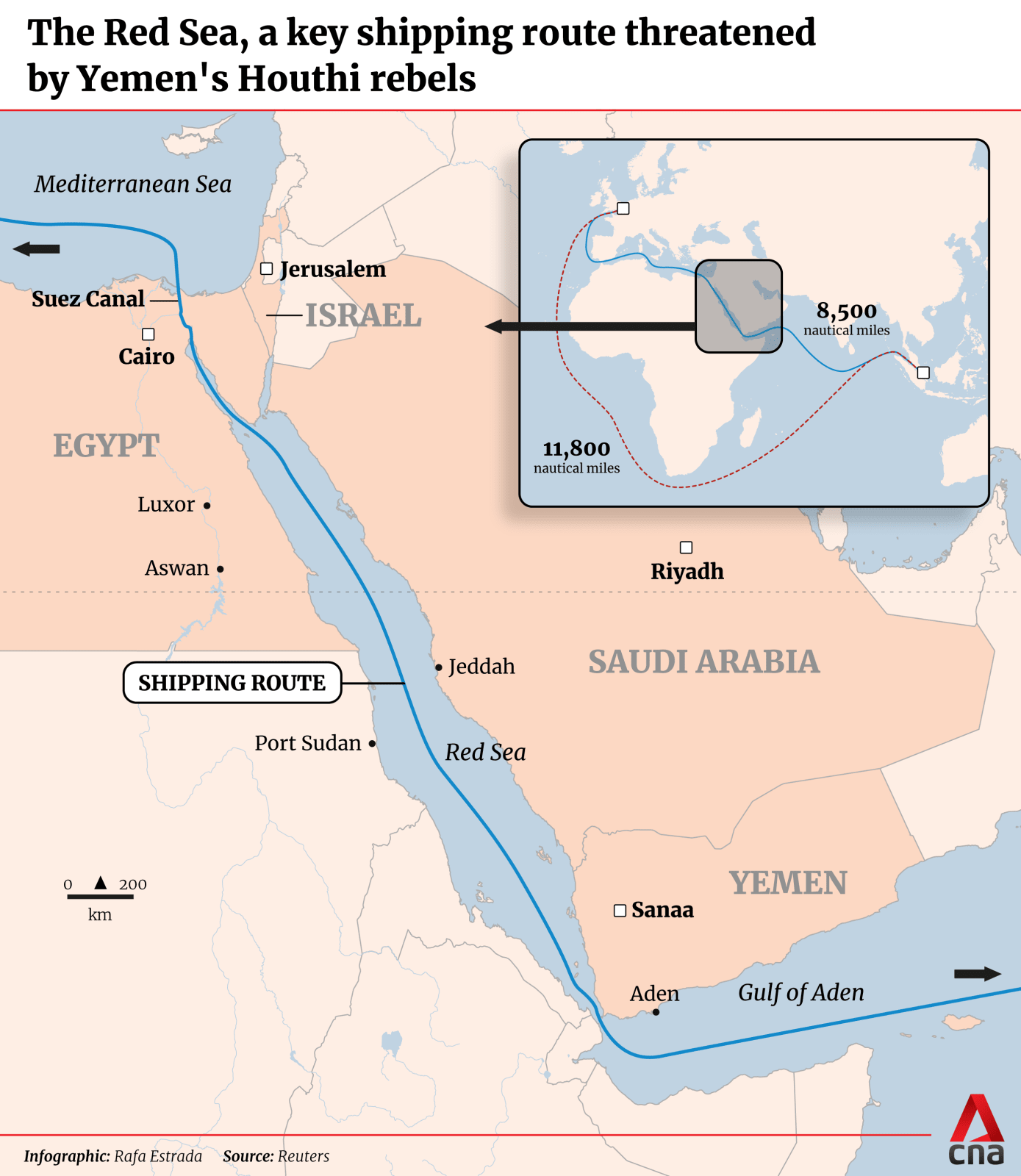 Many of the attacks are launched from near the Bab al-Mandab strait that vessels pass through to enter the Red Sea from the Indian Ocean.